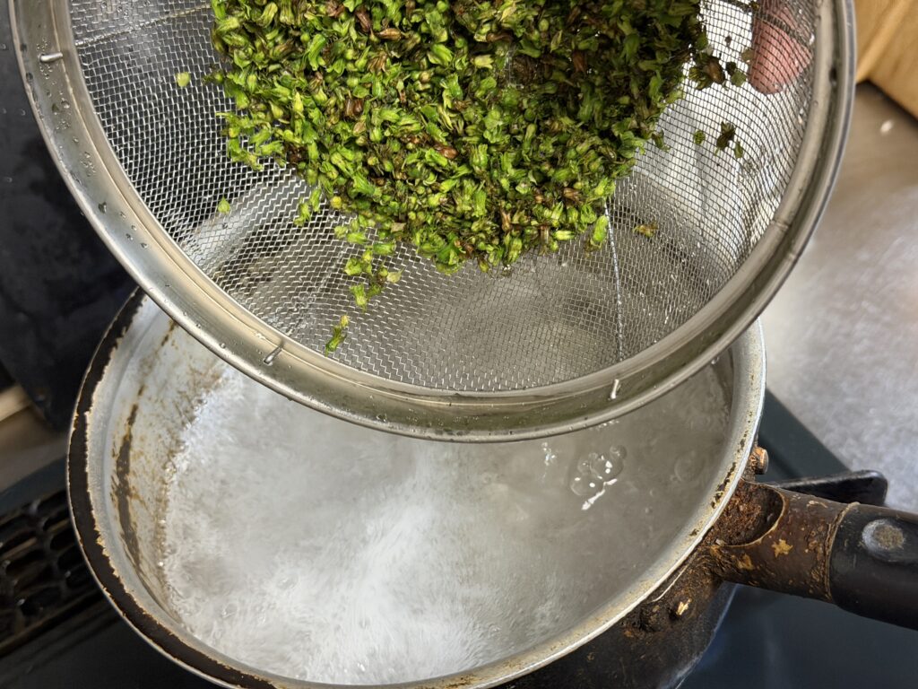これを、塩を加えた熱湯でアク抜きのために軽く茹でていきます。