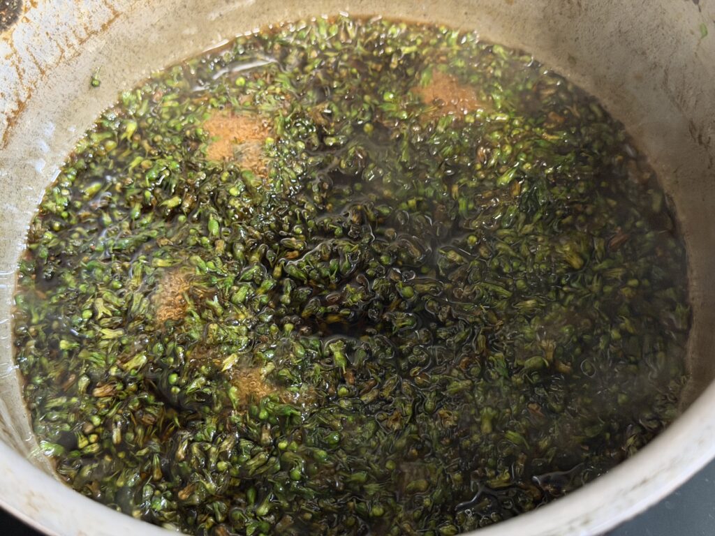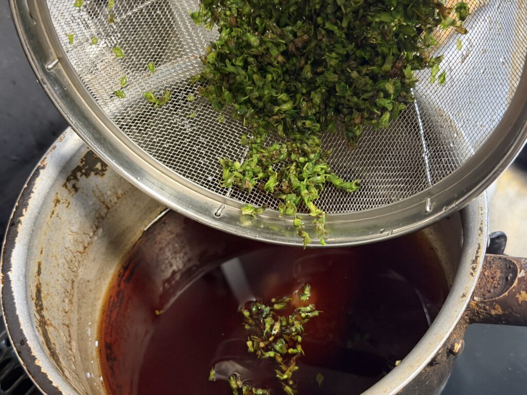 アク抜きしてよく水を切ったシソの実を、今度は醤油・酒・味醂・砂糖で味を調えた調味液に入れて、火に掛けます。
