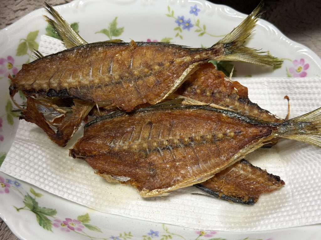 鯵でお刺身を作った際、残った中骨を揚げて、塩を軽く振ってせんべいにしました( ^o^)ノ。