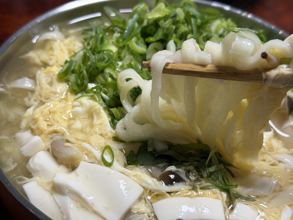 柔らかめに煮込んだうどんに豆腐を入れて、片栗粉でとろみを。