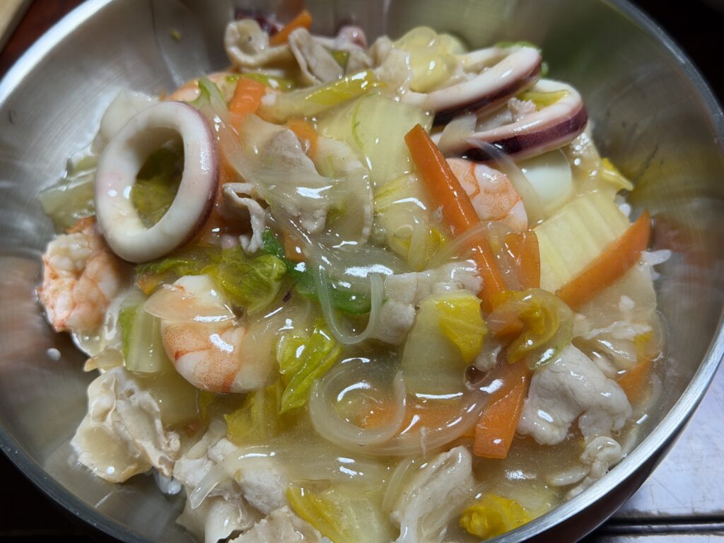 なので、全然釣り方が分からなくて、適当な具材とクックドゥの八宝菜の素を買ってきて、それを中華だしと水、片栗粉を使って伸ばしました。