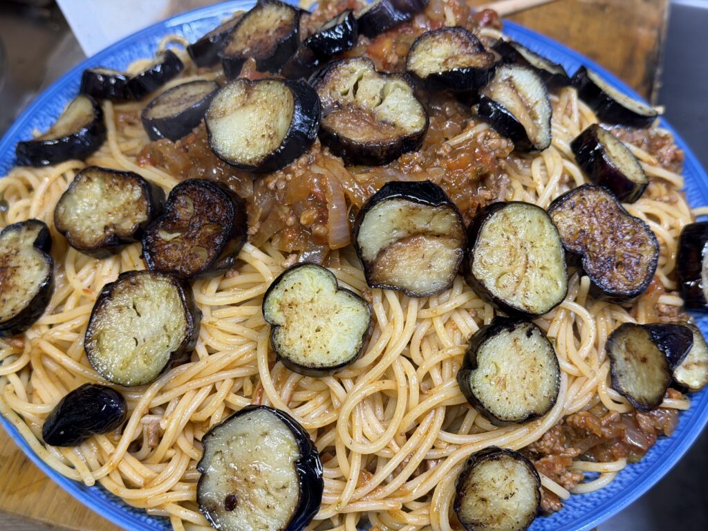 時間が無くて、以前作って冷蔵庫で保存しておいたミートソースを使ったパスタを作ろうとしたのですが、どうしてもカミさんが揚げ茄子を載せて欲しい、というので乗せてみました…。