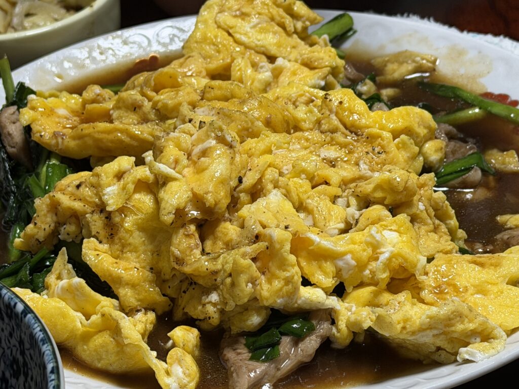豚肉とニラを甘ダレで炒めて、その上に大量の卵焼きを載せました( ^o^)ノ。
