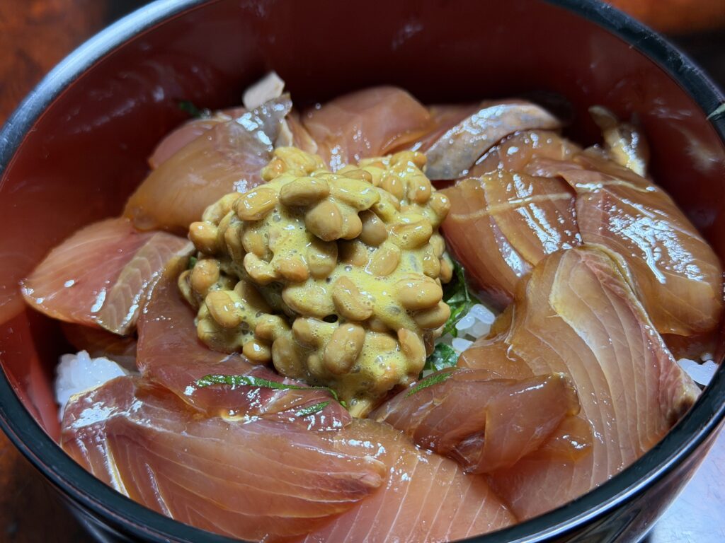 ブリの背身が安く売っていたので、生姜を効かせた醤油に軽く漬け込んで、真ん中が空いてしまったので納豆を載せて…。