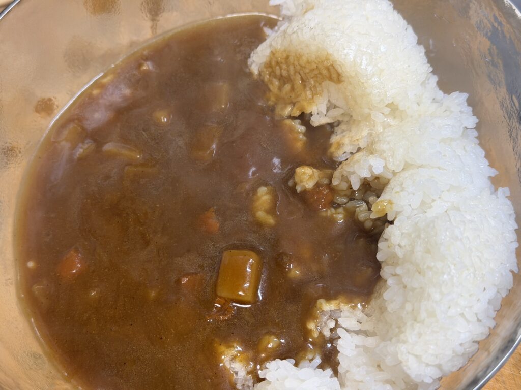 夜勤明け、自家製備蓄米をDAISOのメスティンで炊いて、レトルトカレーをかけて夜食にしました。