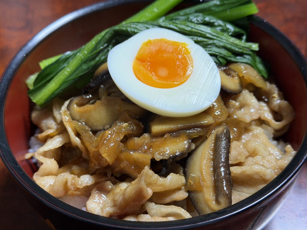 しゃぶしゃぶ用の豚バラ肉をタマネギと椎茸で炒り煮にしてご飯へドンッ。