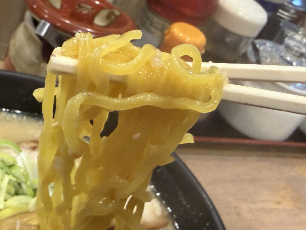 早速箸を取って頂くのですが、札幌ラーメン特有の、濃い黄色の麺で、少し透き通っています。