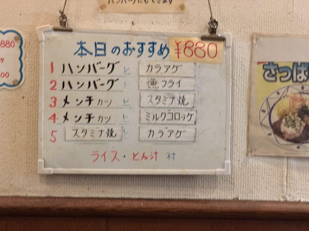 カミさんには何も言わないで連れて行ったので、お店に入ってから何を食べよう、何が美味しそうなのか、頭フル回転で悩んでいるカミさんを横目に、私は「本日のおすすめ」の中の2番、「ハンバーグと魚フライ」の定食を注文することにしました。