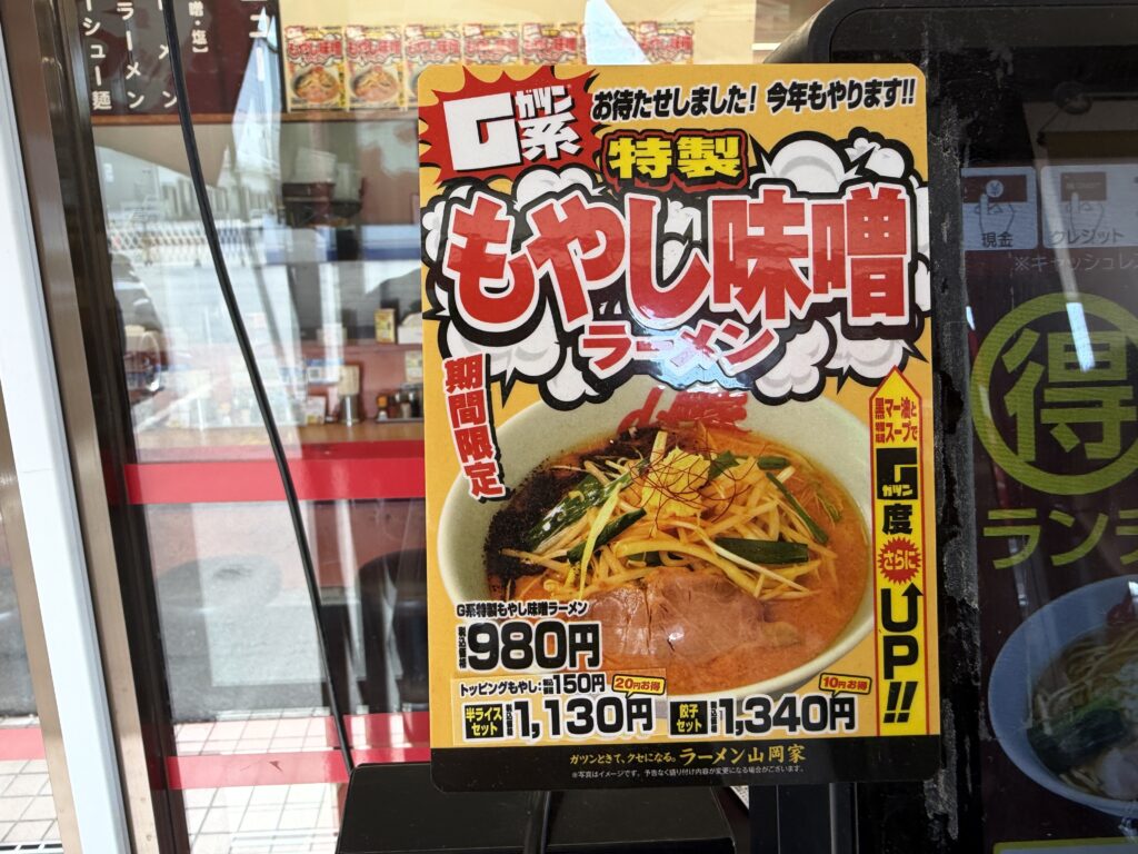 んで、お店に入ろうとすると、入口のトコロにでかいポスターが貼ってあって、期間限定の「特製もやし味噌ラーメン」とのこと。