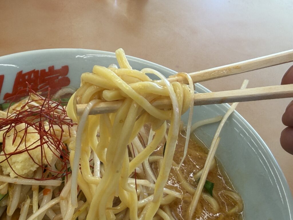早速箸を取って頂くのですが、少し太めのもちもちの麺がなかなか味噌スープに合って、普通に美味しいです( ^o^)ノ。
