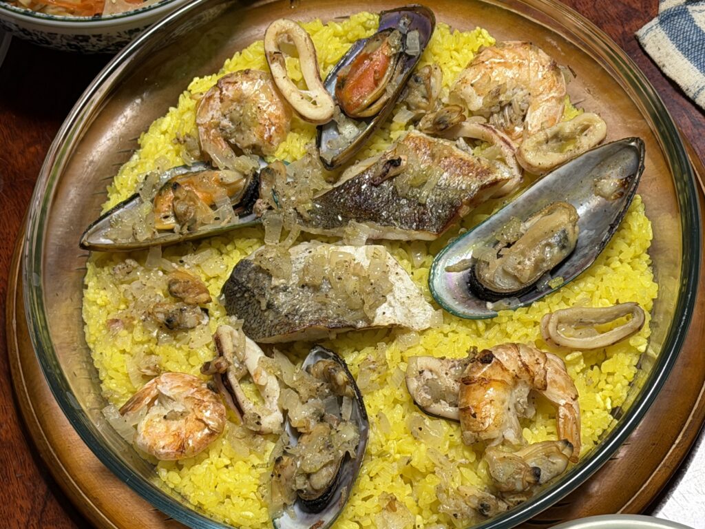 家で作ってみたのですが、まぁ…これをパエリアとは信じないで欲しい、外で食べる本物のパエリアは、この100倍美味しいよ、と息子に言い聞かせました(^^;。