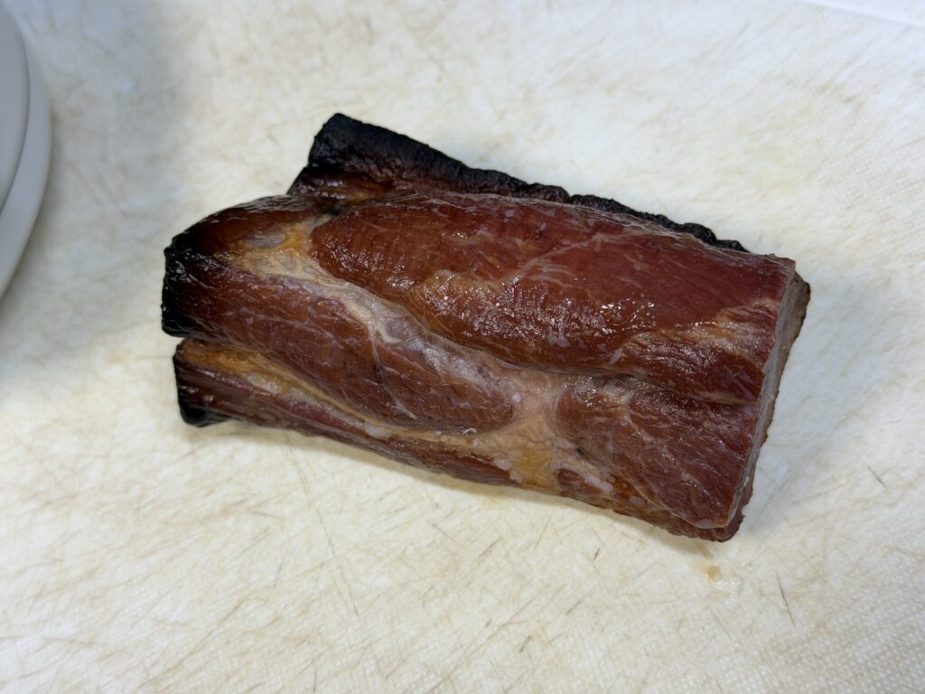 肉類はなかったので、先日親友が誕生日だったのですが、その時にプレゼント用に焼いた焼豚のうち、我が家用に確保しておいたモノがあったので、それを活用します。