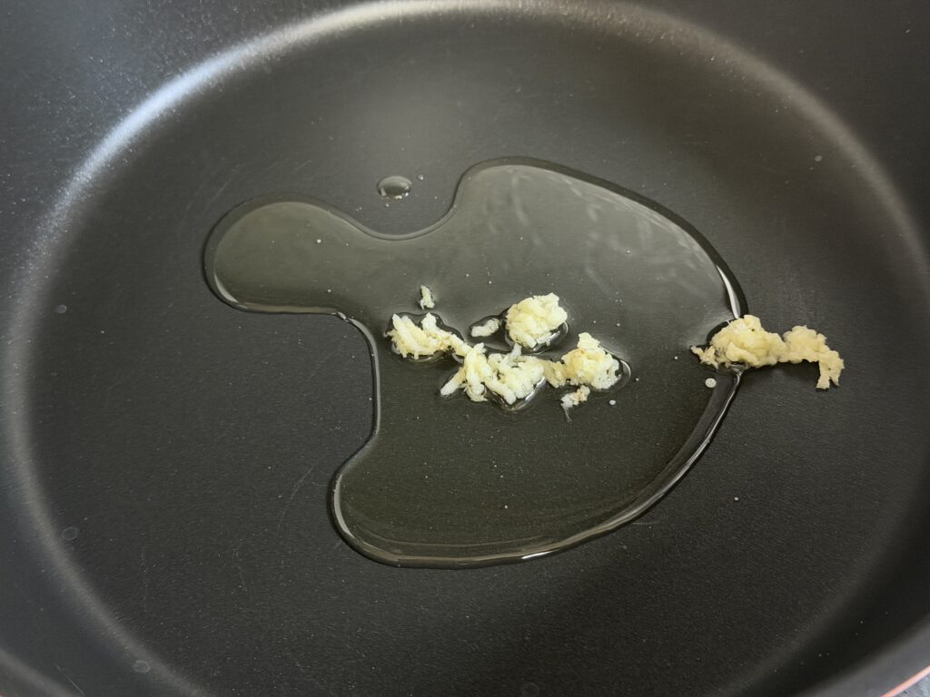 大きめの鍋に湯を沸かし、その隣でフライパンにサラダ油、そしてニンニクを投入。
