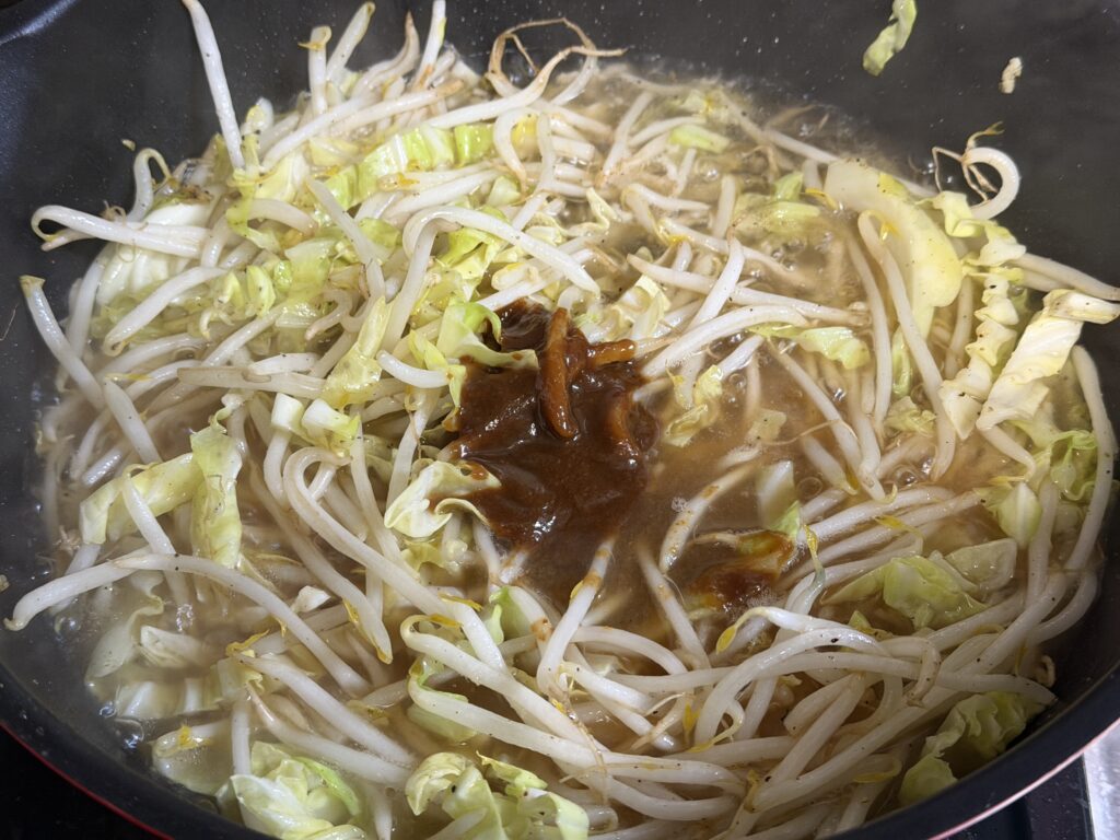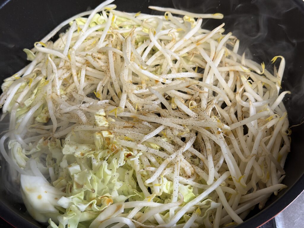 麺をお湯に放り込んでよく解し、隣のフライパンにもやしとキャベツを投入。