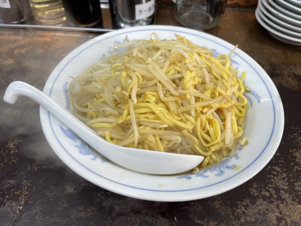 早速箸を取って頂くのですが、少しとろみのある少なめのスープに、麺…と言うか細切れになってもやしよりも長さが短いような麺の残骸的なものを、そのもやしと一緒に頂きます( ^o^)ノ。