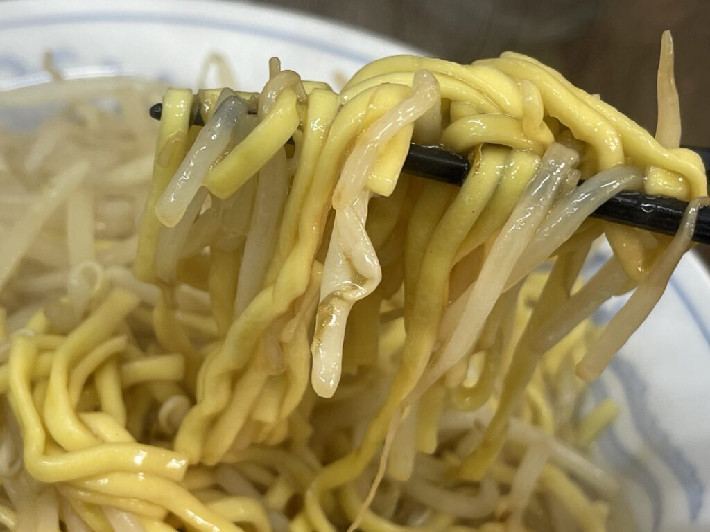 黄色い麺にモヤシがたっぷりと混ざっています。