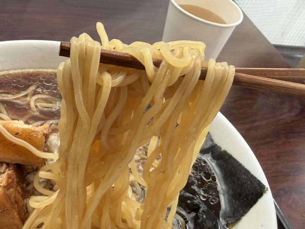 大盛りにしたので麺がラーメンの表面から顔を出してしまっていますが、前に食べたときの生麺より、よりストレート感が増しているように感じられます。