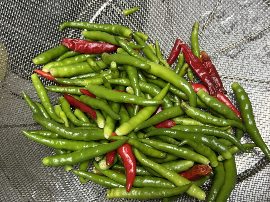 葉っぱをしっかりとむしって葉唐辛子にしたのですが、当然ながらたくさんの唐辛子も手に入りました。