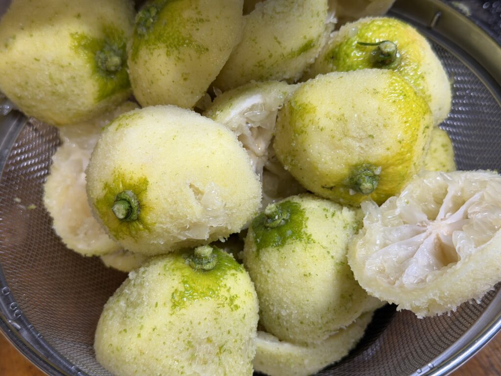 ちなみに、こちらが外皮を剥かれて果汁まで搾られた、柚子の残骸です…(^^;。