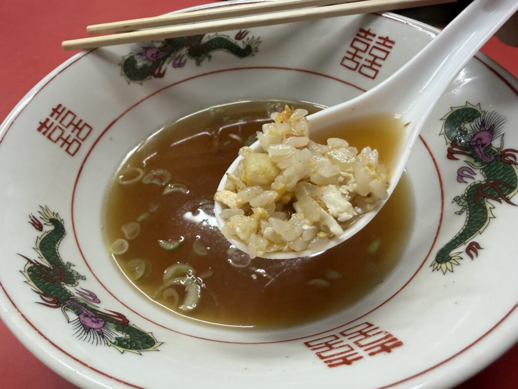 そして、このチャーハンの美味しい食べ方が、レンゲにチャーハンをすくい、そこにラーメンのスープを少しすくう。