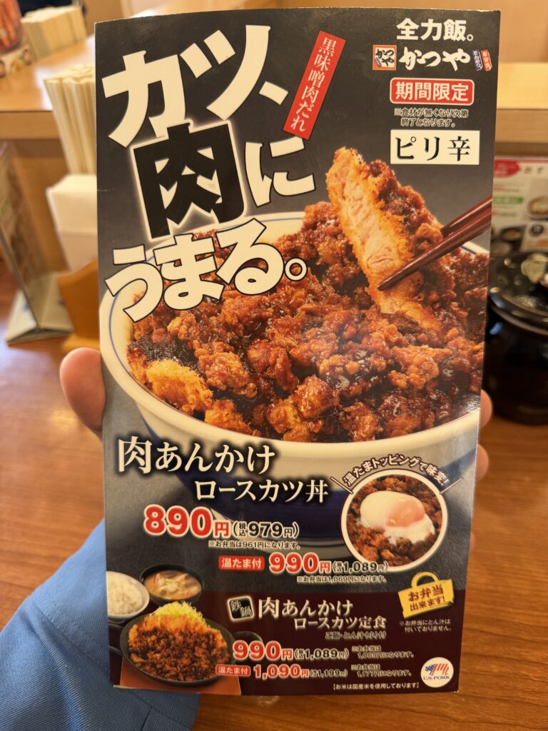 とりあえず入店して、適当なカウンター席に座ってメニューを見てみると、限定メニューとして “ピリ辛” と言う文字とともに「肉あんかけロースカツ丼」というのがありました。
