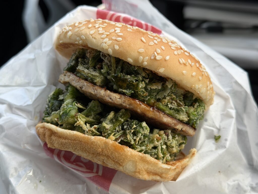 私は、東習志野の『ドムドムバーガー』で「春菊かき揚げバーガー」に出会って瞬間、これは私が食べるべき挑戦である、と信じました( ^o^)ノ。