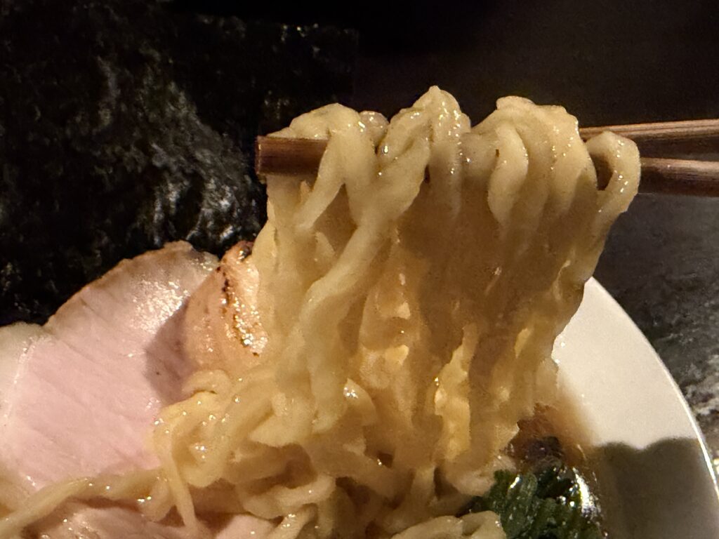 早速箸を取って頂くのですが、ビロビロの平打ち麺は縮れが強く、もちもちムッチリと言った食感。