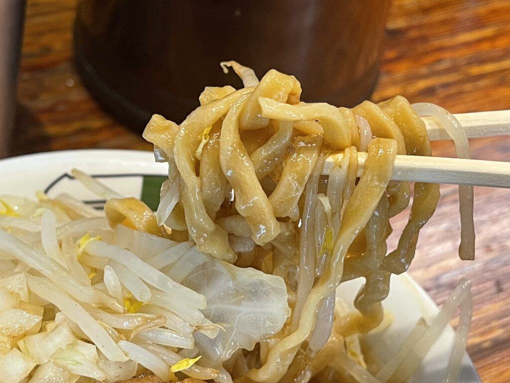 早速箸を取って頂くのですが、もやしとキャベツの隙間から引きずり出した麺は、まるでうどんのような太さと形状( ^o^)ノ。