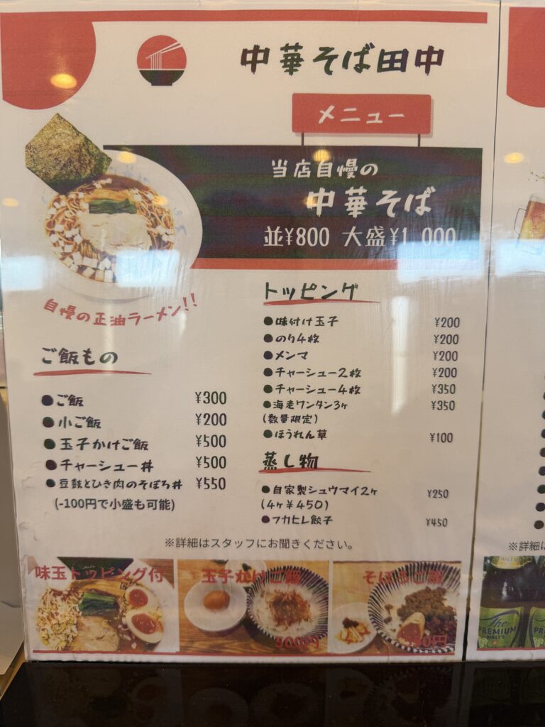 基本は「中華そば」のみのようで、他にトッピングにご飯物、蒸し物などもあるようです。