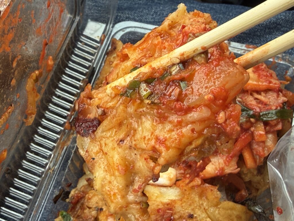 実際、蓋を開けて食べてみると、小麦粉の生地に刻んだイカなどが入っていて、キムチがどちゃっと乗っています(^^;。