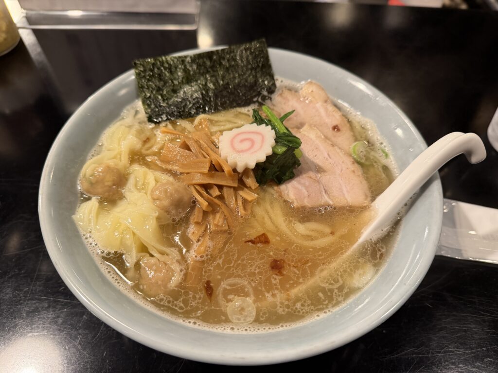 観ると、少し白濁した白いスープにワンタンを始めとした、ラーメンの醍醐味である各種の具材が載っています。