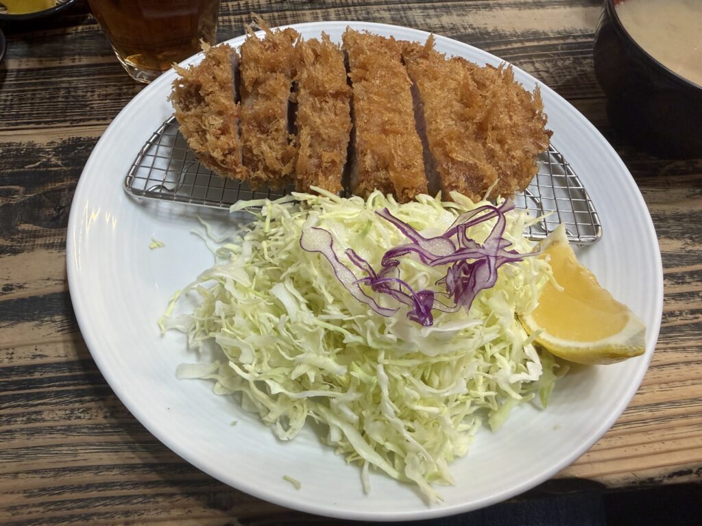 しばらくすると各人のお漬物やご飯、味噌汁が届いて、メインのカツも運ばれてきました。