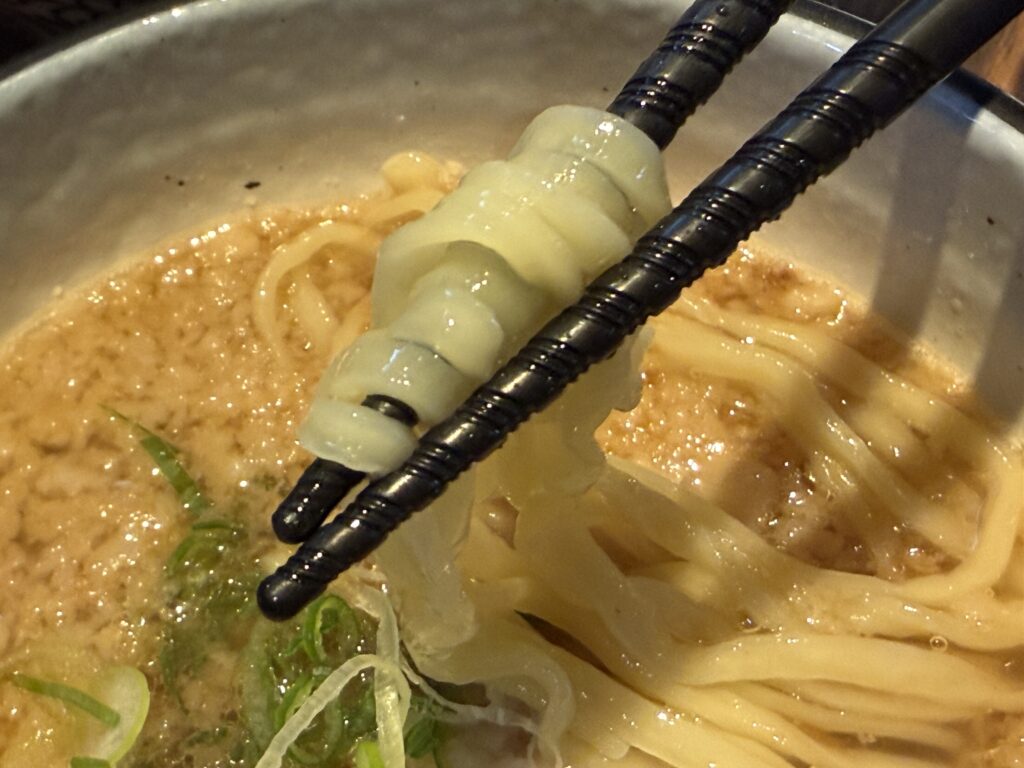 さらに、少し強めの塩味の効いたスープは、ほんのり甘みもあって脂ギッシュで、それでいて麺の冷たさもあってかそれほど重く感じず、つるつると入ってしまいます( ^o^)ノ。