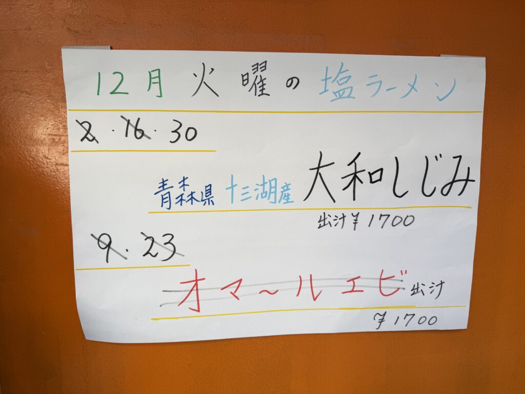 そんなわけで、今年最後の食べ納め、と思ってお邪魔しましたが、この日は「青森県十三湖産 しじみ出汁の塩ラーメン」の日でした( ^o^)ノ。