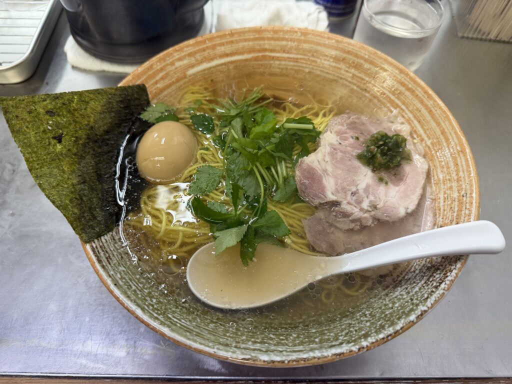 見た感じは、完全にいつもの塩ラーメンのそれ、と言った感じですが、年末と言うこともあって、この日はちょっと自分を甘やかして、煮卵をトッピングで付けてもらいました。