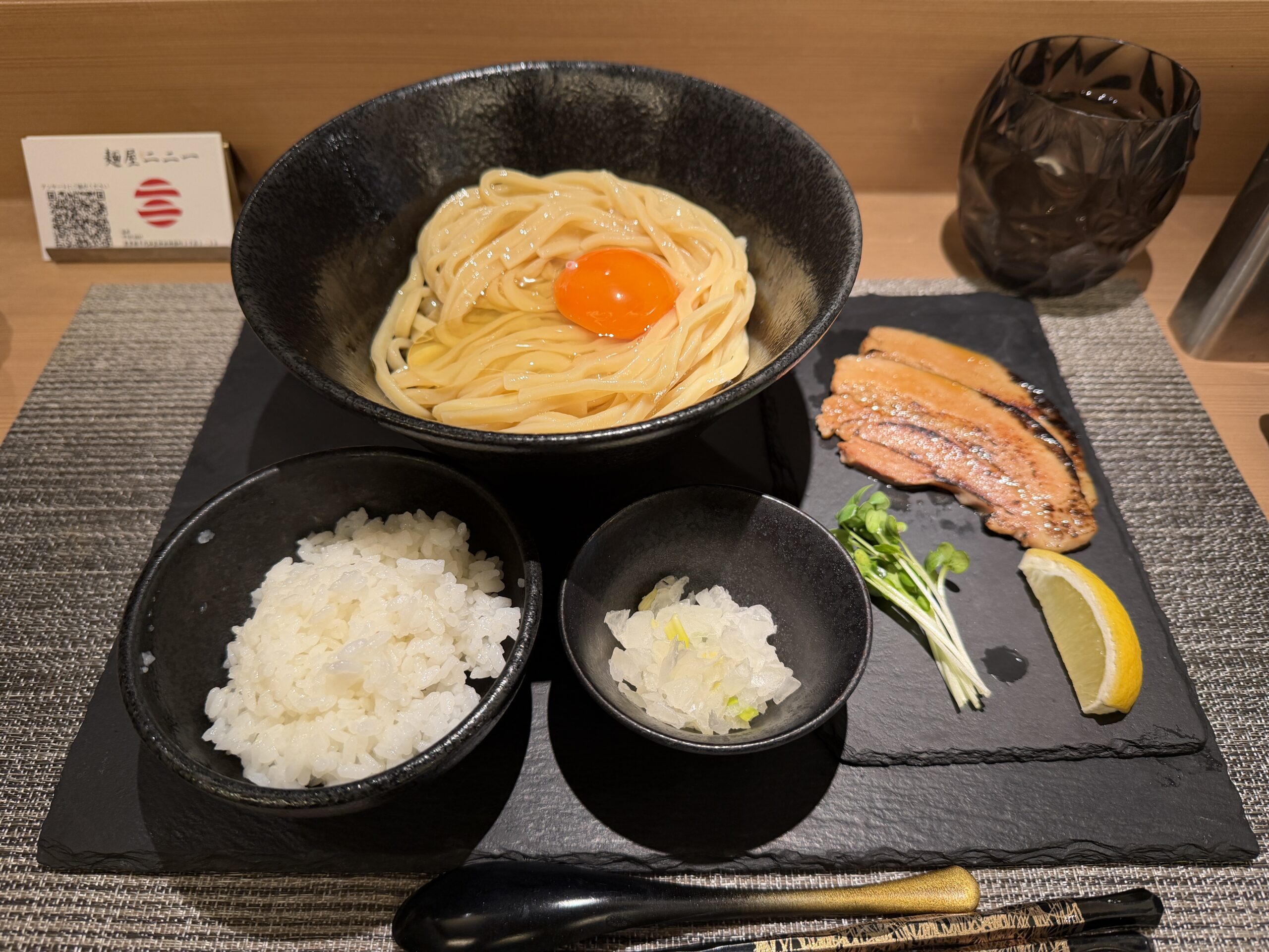 お冷やで一息つきつつ、スマホでいろいろ時間を潰しつつぼ~っと調理を眺めていたのですが、程なくして薬味や具材などの提供を受け、最後に麺の入ったどんぶりを受け取りました( ^o^)ノ。