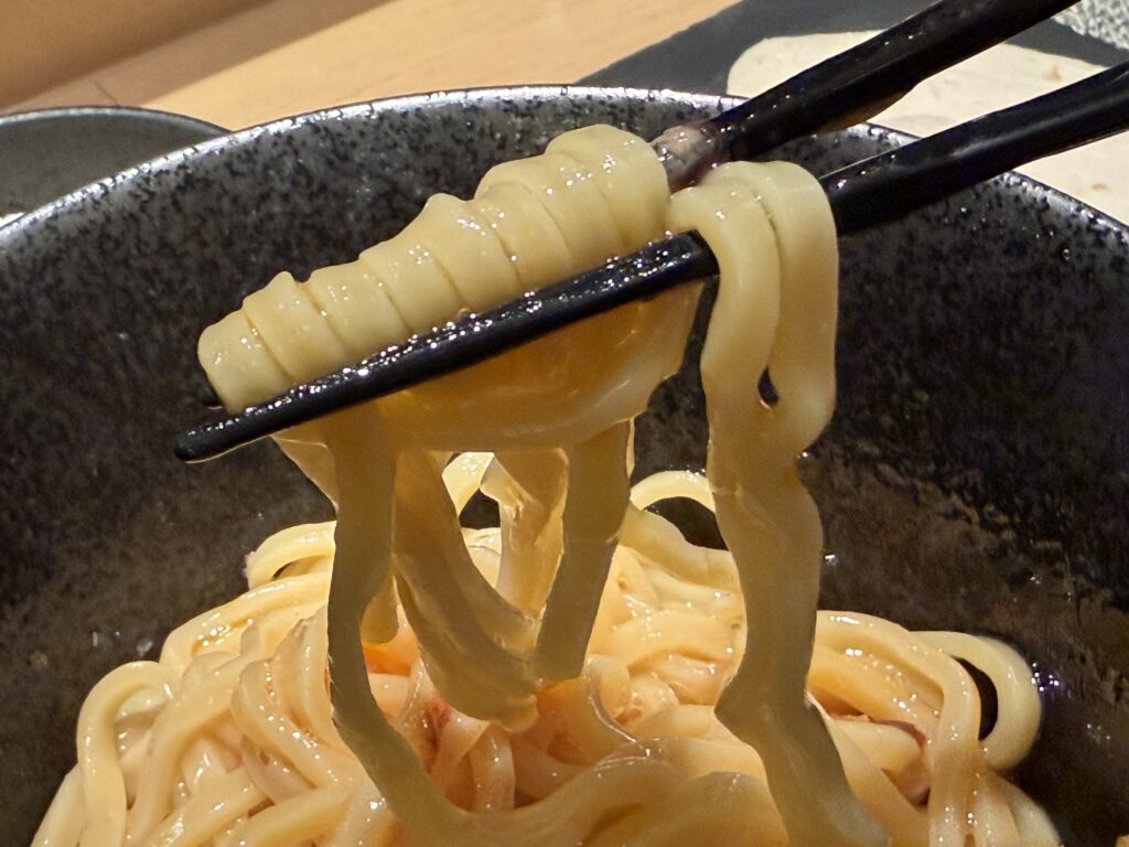 麺はもちもちの太麺で、実際に食べてみると生卵の円やかさ、醤油ベースのタレの芳醇な美味しさ、全てが合わさって、卵かけご飯を麺にした、という単純な計算式では表現しきれないような美味しさがあります( ^o^)ノ。