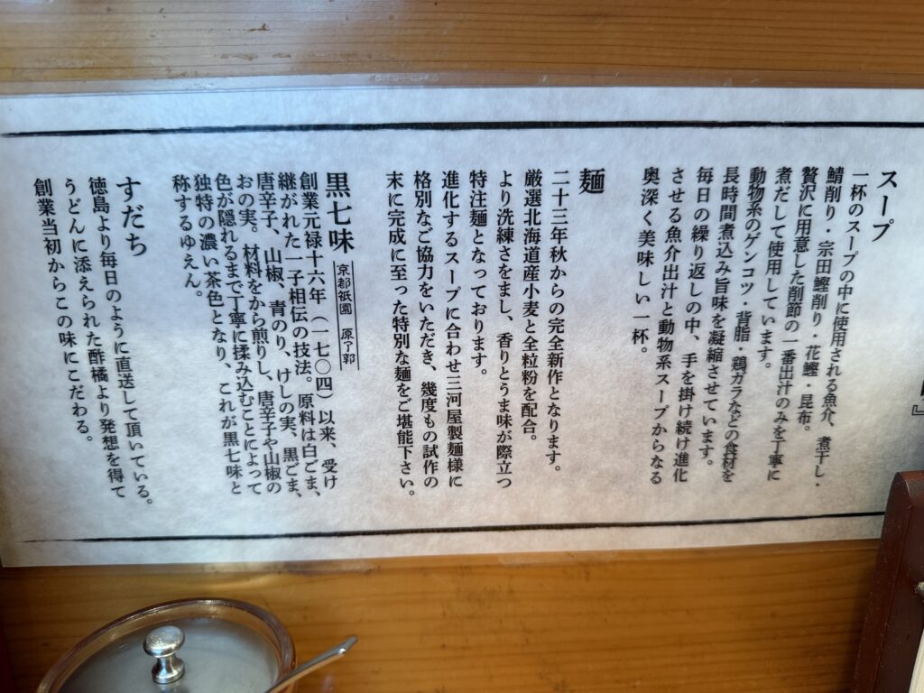 私はガンガン食べ進めて、途中、すだちを搾ったり黒七味を加えたりと味変を楽しみ、最後はスープ割りをして完食( ^o^)ノ。