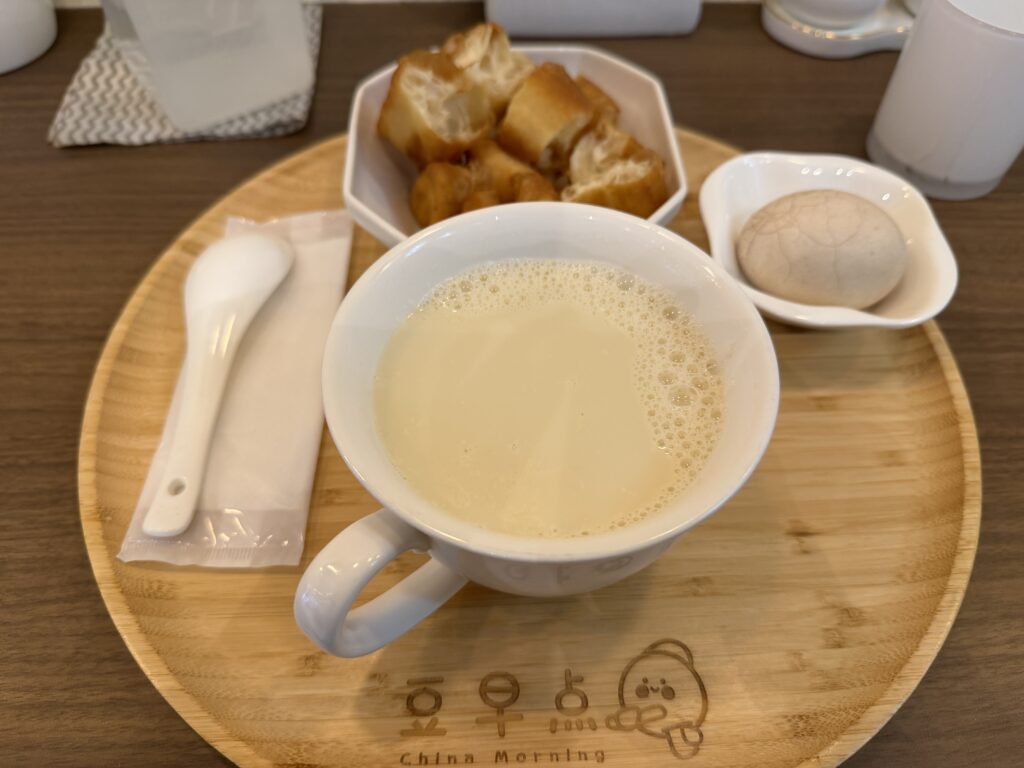 提供されたのは大きめのカップに注がれた温かい豆乳と、刻まれた油条。そして味玉です。