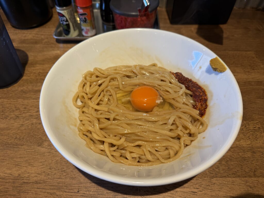 これは具材がもやしオンリーの非常に味わい深いメニューなのですが、この日頼んだのは「TKM」、つまり「タマゴかけ麺」になります(^^;。
