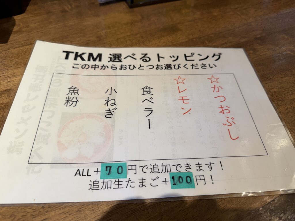 で、食券を渡すと店員さんから専用のオーダーシートを受け取りますが、なんでも一つだけトッピングが無料で付けられるのだとか。