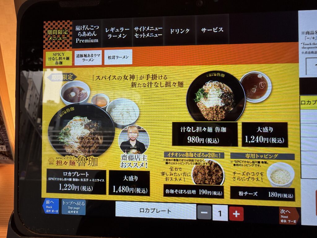 そんなわけでカウンター席に座って、据え付けのタブレット端末を操作していると、SPICY汁なし担々麺なるものがありました。