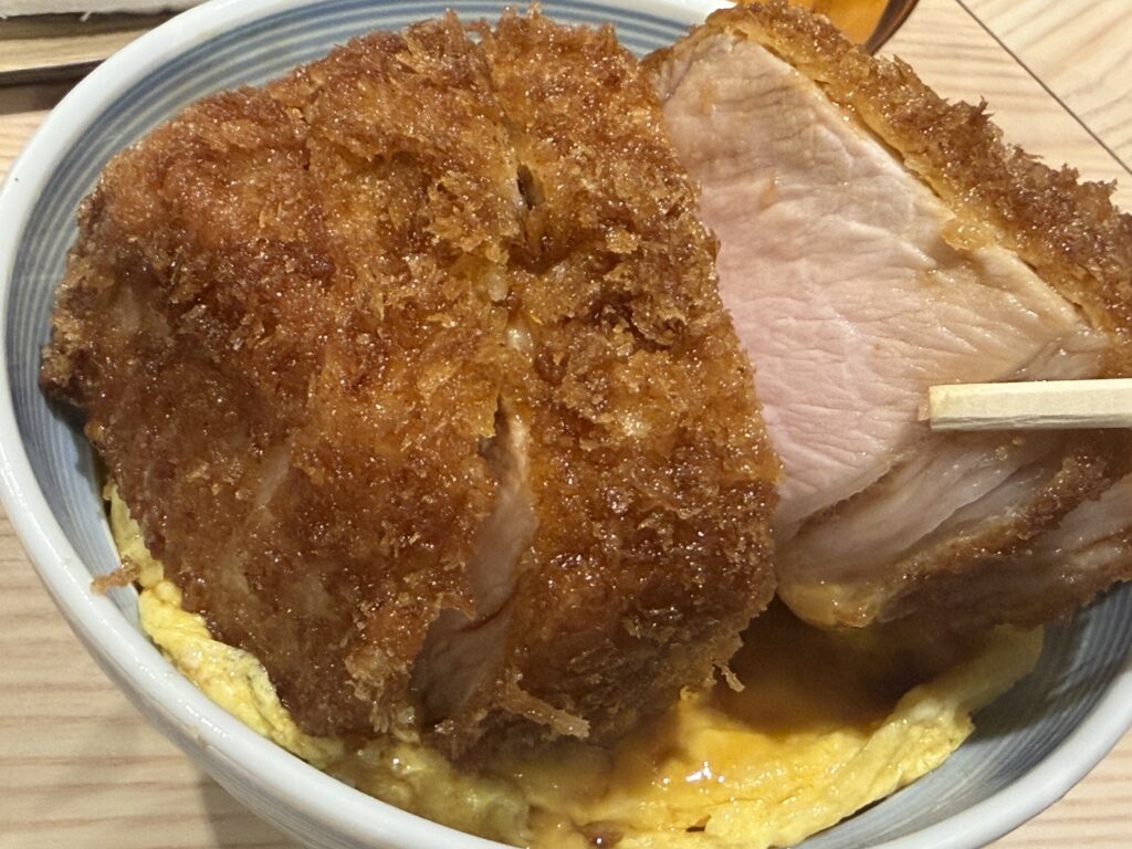 こういうカツ丼は初めて見たのですが、まずご飯に甘辛いタレがかかっていて、その上に半熟の卵焼き。そしてその上に、ご飯と同じ甘辛いタレを纏った極厚のカツが乗ってくる、と言うような感じです。