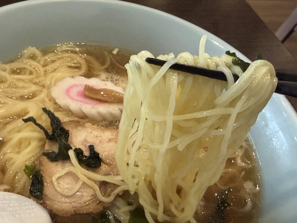 実際に箸を取って食べてみると、強いスープに細めの麺、ラーメンの味わいではあるのですが、これが想像以上に美味しく感じます( ^o^)ノ。