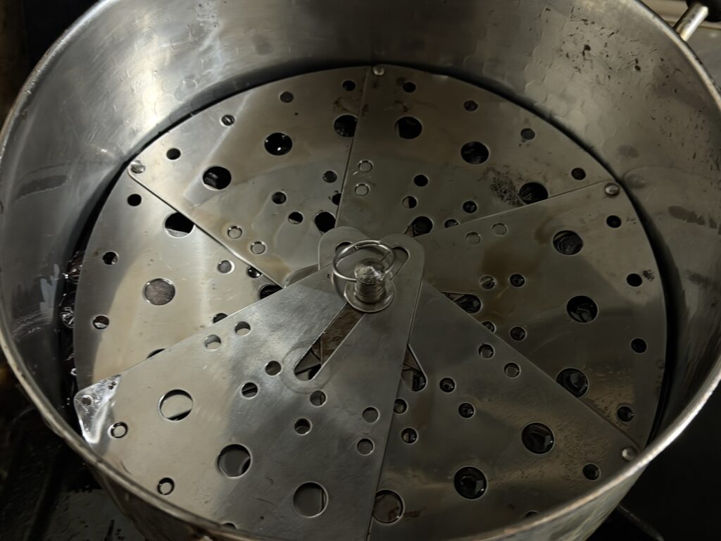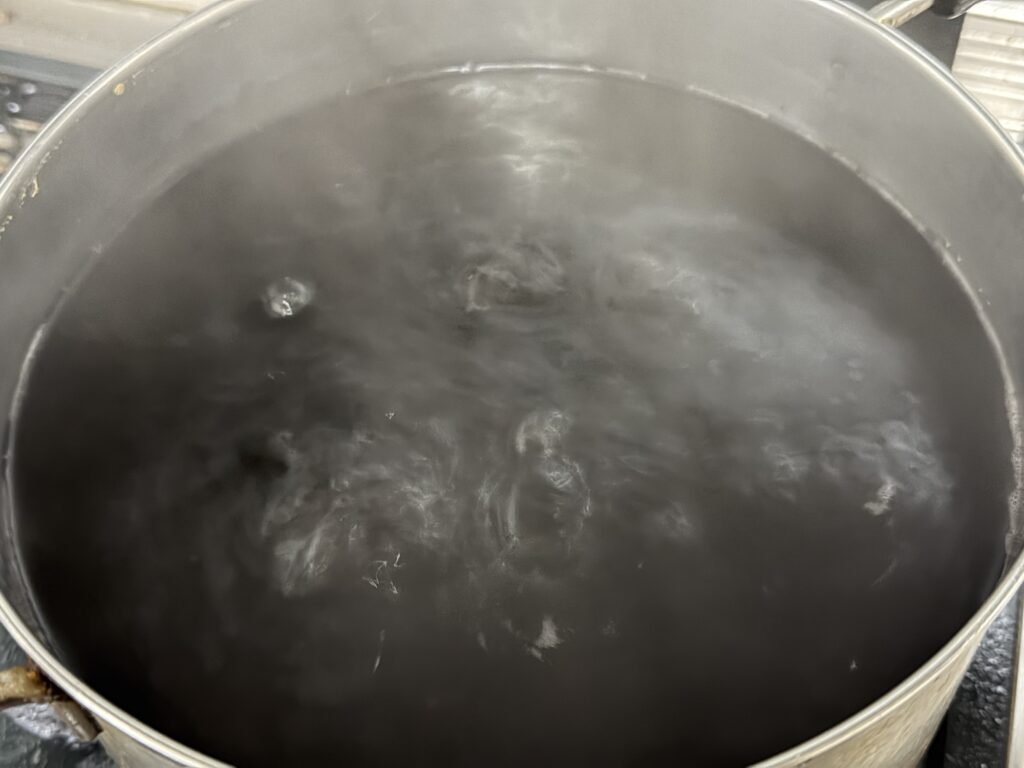 まず、黒豆を煮始めたところからなのですが、この鍋の中に、実は金属製の落とし蓋が沈んでます(^^;。