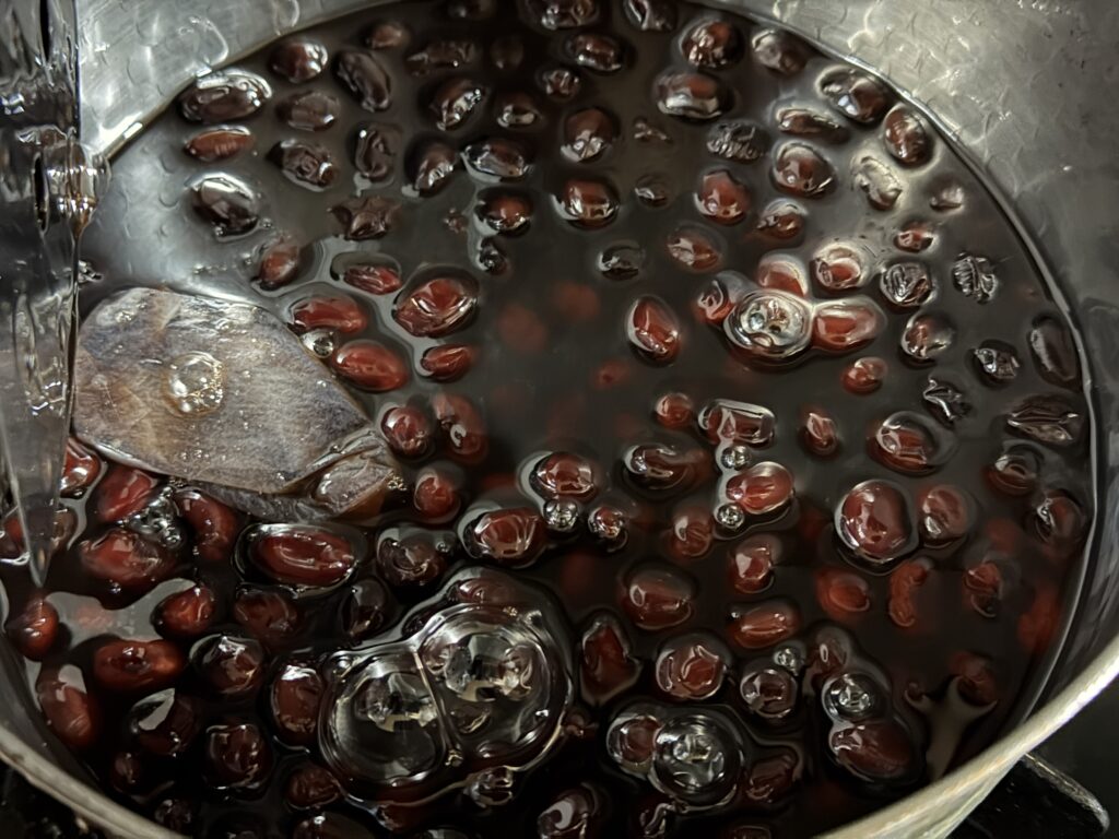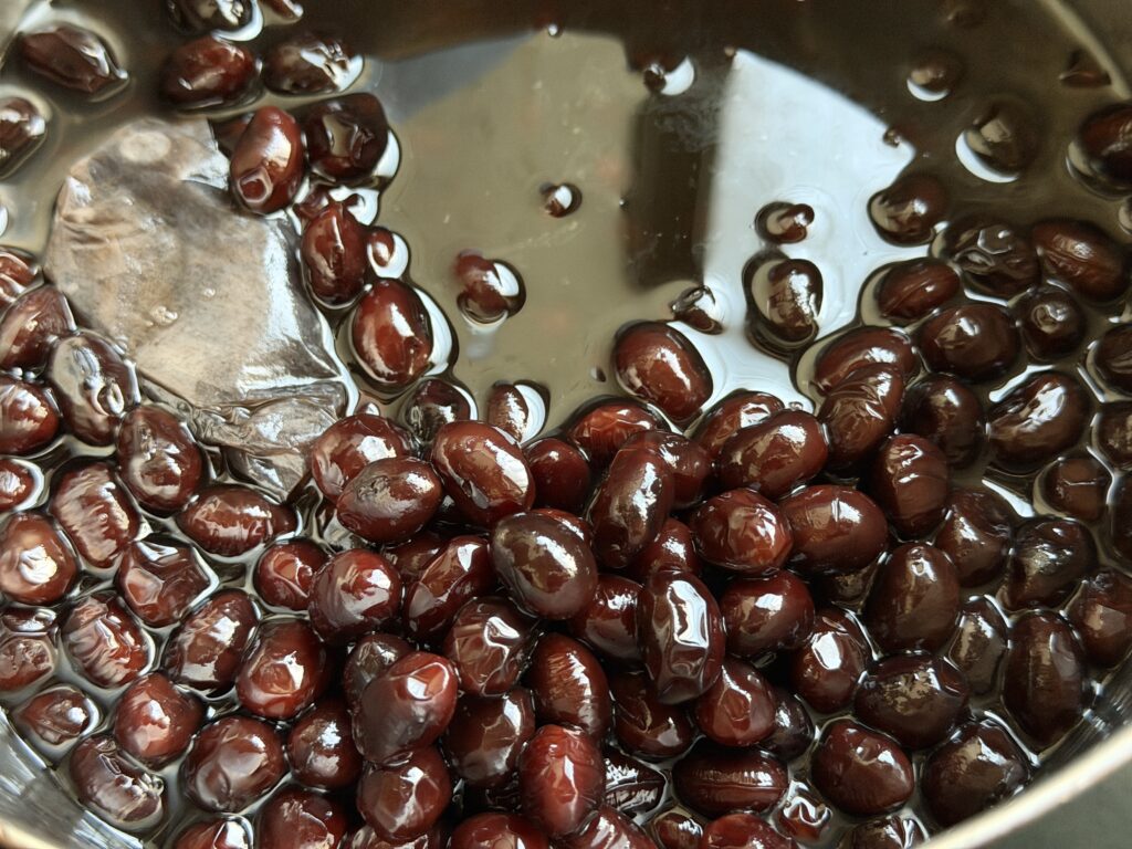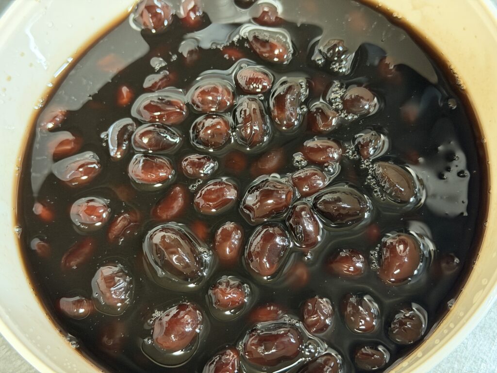 ただ…よく見ると豆にしわが寄っていて、豆も黒豆という寄りかは赤豆、と言った感じです(^^;。