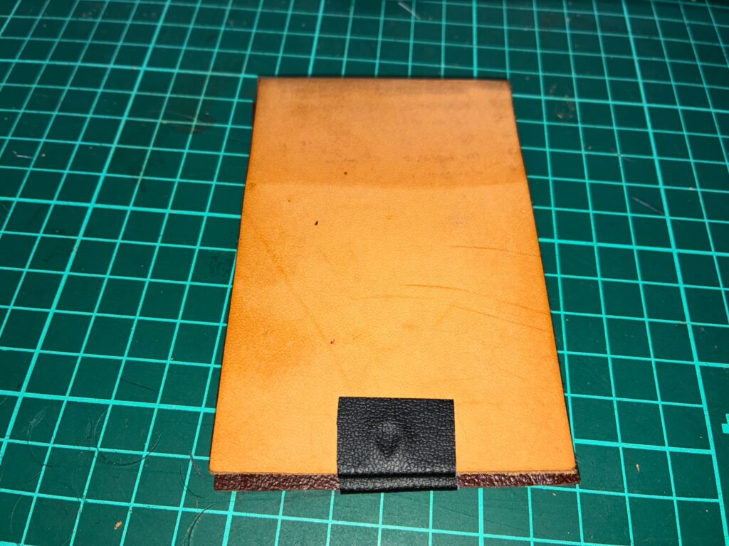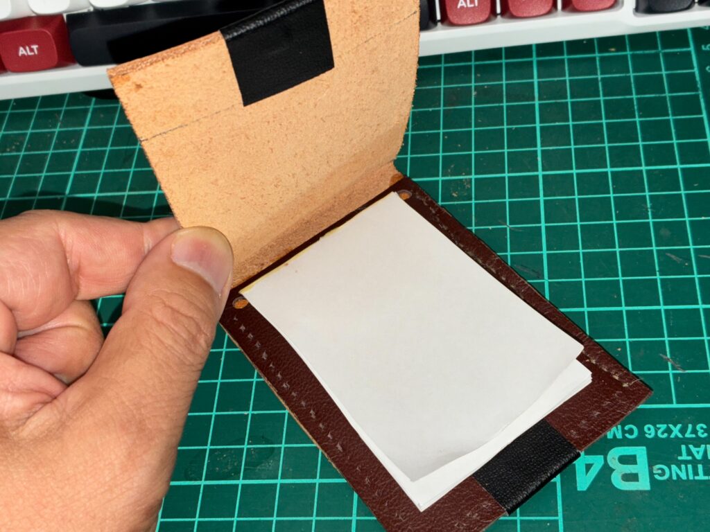 んで、薄い皮を内側に張り付けて、メモ帳を固定する層を作りました。