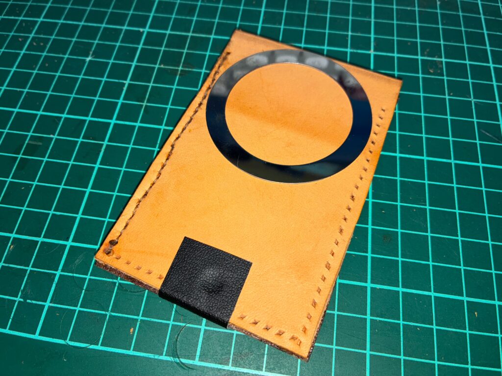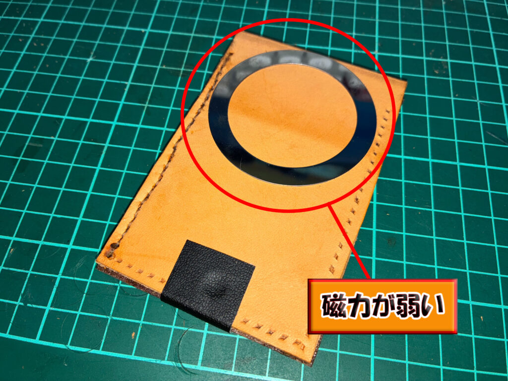 革ケースの下端にDAISOで買った小型のネオジム磁石を仕込み、同じくDAISOで買った補修用のフェイクレザーのシールで簡単に隠します。