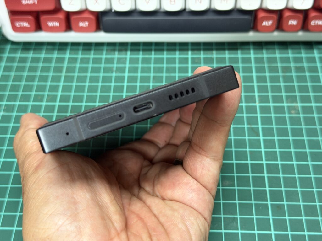 底面はマイクとスピーカー、SIMスロットに挟まれるようにUSB-C端子。